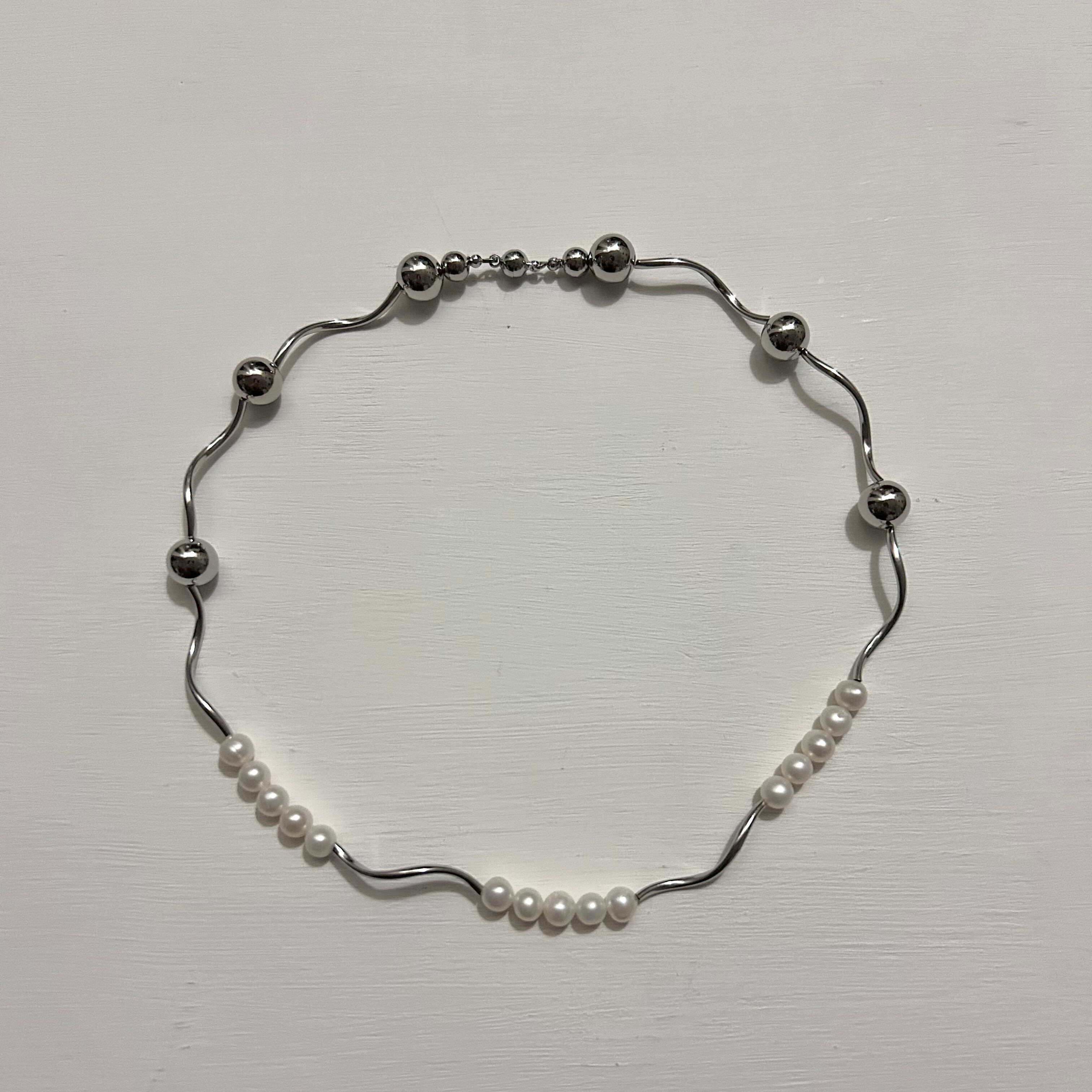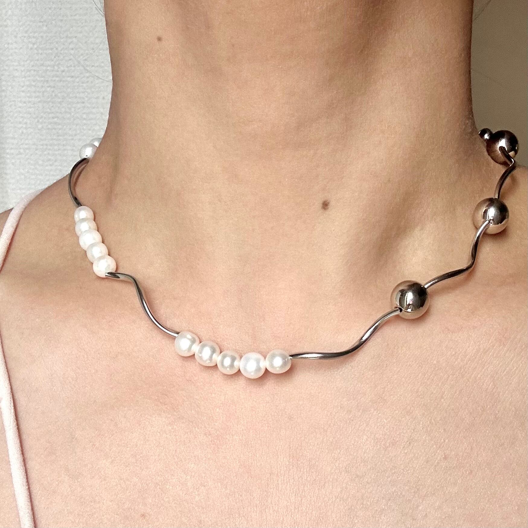 うねうねした波と、大きめのビーズと組み合わせ個性の光るデザイン